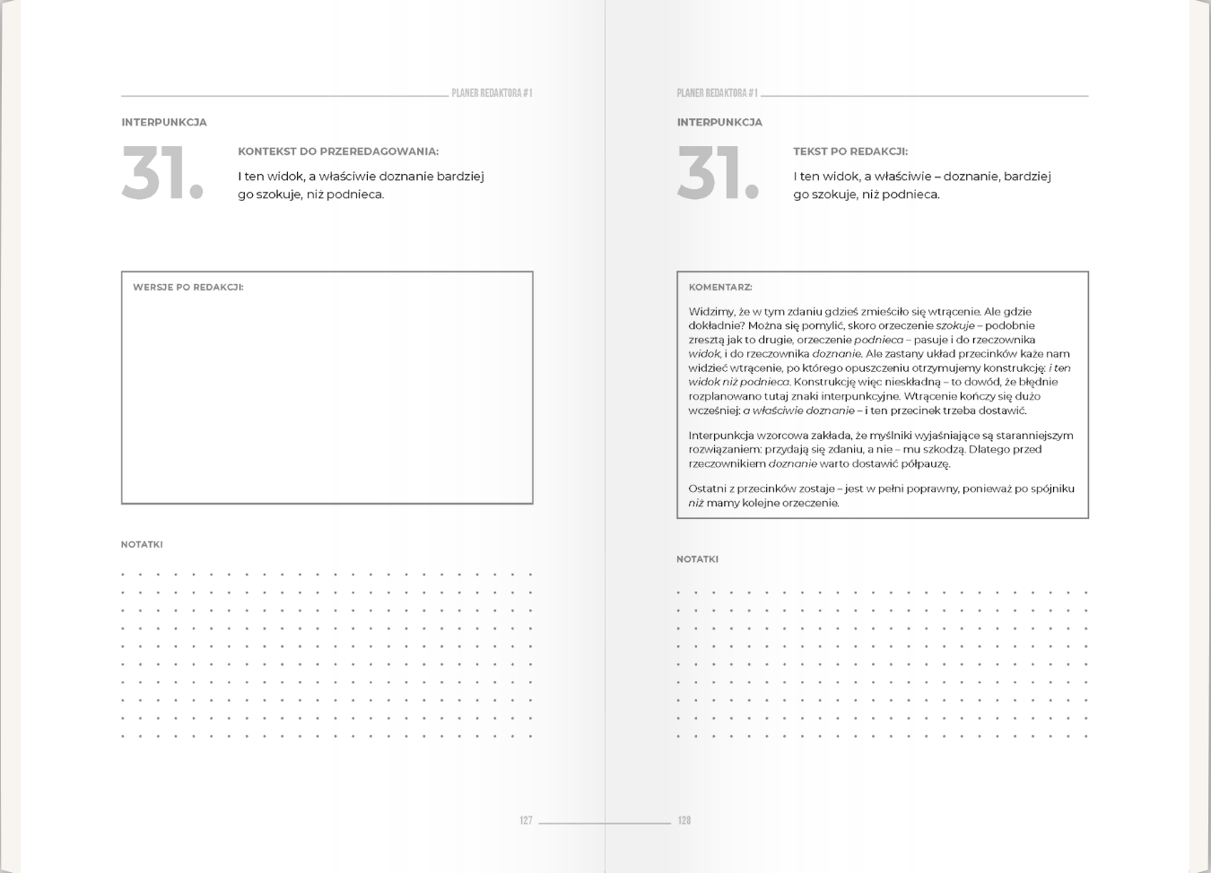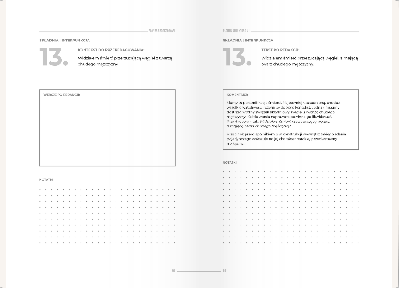 Korektę techniczną wielu redaktorów i korektorów uważa za formalność. Dla nas ostatnia prosta – czas przed oddaniem plików do druku – to najbardziej intensywna praca nad publikacją. Walczymy wtedy do ostatniej litery, do ostatniego ogonka. W egzemplarzach przedostatecznych znajdziesz pełną zawartość merytoryczną Planera redaktora #1: 31 nieoczywistych kwestii językowych, 31 eksperckich komentarzy językoznawcy, plan miesiąca, plany i podsumowania tygodni, rejestry zleceń, listy kontrolne, zdefiniowane tabele oraz miejsce na notatki. A oprócz tego: 57 błędów o zróżnicowanych poziomach istotności. Ciekawe, czy potrafisz wskazać je wszystkie. Nasi kursanci wskazują średnio tylko 8–24 usterek. Dostajesz kompletny produkt: 200 stron, trwałe szycie, papier najwyższej jakości, okładkę odporną na zarysowania, lakier punktowy na okładce (egzemplarze uszkodzone, w których brakowało stron lub zadruku, zostają u nas jako notatniki – luksusowe, bo również z lakierem strukturalnym na okładce!).